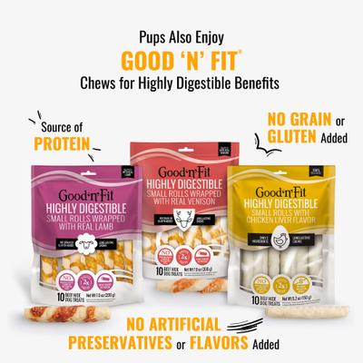 Treat your furry friend to the ultimate chew experience with Good 'n' Fun Long-Lasting Triple Flavor Stuffed Rolls Beef, Chicken, & Peanut Butter Rawhide Dog Chews. These long-lasting chews are made with a delicious combination of beef hide, chicken flavor, and real peanut butter flavor that will have your pup begging for more. The chewy center is packed with the tastes your pup craves, making it a satisfying and healthy way to satisfy his natural urge to chew. Plus, that chewing action helps reduce tartar buildup and remove plaque for a healthier smile. These chews are paw-fect for medium- and large-sized canine companions and are a good source of protein. So, let your pup indulge in this tasty and chewy treat while you enjoy his happy tail wags.