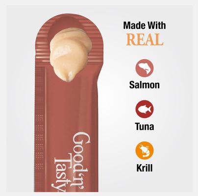 The Good 'n' Tasty Savory Spoonable Cat Treat features a built-in spoon, so your furbaby can enjoy a su-purr tasty, lickable treat with less mess. These triple flavor purees are packed with a savory combination of chicken, salmon, and duck. These treats contain vitamins and minerals, plus taurine to support your best friend’s health. They’re free of artificial flavors, colors or preservatives, and contain no chicken byproduct, carrageenan, or added grain, corn, wheat, or soy.