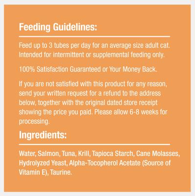 Feeding Instructions:Feed up to 3 tubes per day for an average size adult cat.