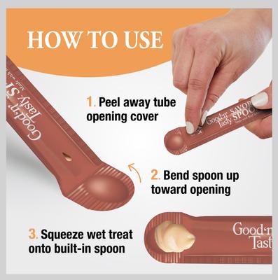 - This squeezable, lickable cat treat comes with a built-in spoon for more fun and less mess.