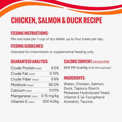 Mix one tube per one cup of dry kibble, up to four tubes per day. Intended for intermittent or supplemental feeding only. Also, use to help with transition feeding. To use, tear off top at the notch. Next, squeeze on top of your dog’s kibble and give it a good mix to cover all the food. Then, serve to your dog for a tasty mixer on top of their dry food during mealtime. For thicker coverage, use one tube per ½ cup of kibble. For lighter coverage, use one tube per one cup of kibble.