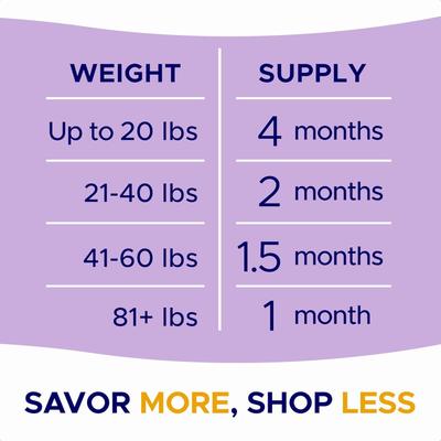 Feeding Instructions|Weight|Daily Feeding Per Day||---|---||20 lbs & below|1 Chew||21- 40 lbs|2 Chew||41-80 lbs|3 Chew||81 lbs & over|4 Chew|