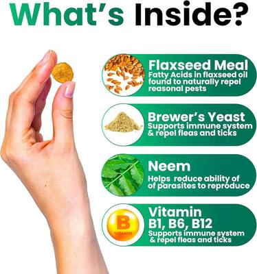 Flaxseed Meal, Brewers Yeast, Neem, Vitamins: B 12, B1, B 6 .