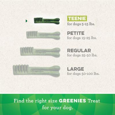 - Made for dogs weighing 5–15 lbs., Teenie Greenies clean down to the gumline and feature a taste dogs love.
