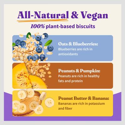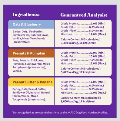 - Features three delectable flavors: oats and blueberries, peanut butter and banana, and peanut and pumpkin.