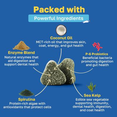 - These chews are formulated with a thoughtful blend of ingredients, including coconut oil, enzyme blend, parsley, sea kelp, spirulina, spearmint, and P-6 probiotics.