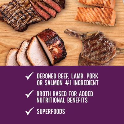 - The recipes contain ingredients like real lamb, beef, pork, and salmon, plus fruits and vegetables for wholesome nutrition.