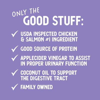 Chicken, Chicken Broth, Salmon, Tapioca Starch, Pea Protein, Tricalcium Phosphate, Guar Gum, Coconut Oil, Apple Cider Vinegar, Choline Chloride, Potassium Chloride, Magnesium Sulfate, Taurine, Zinc Proteinate, Disodium EDTA, Iron Proteinate, Vitamin E Supplement, Thiamine Mononitrate, Manganese Proteinate, Niacin, Vitamin A Supplement, Copper Proteinate, Calcium Iodate, Calcium Pantothenate, Sodium Selenite Riboflavin Supplement, Pyridoxine Hydrochloride, Vitamin B12 Supplement, Folic Acid, Vitamin D3 Supplement, Biotin, Menadione Sodium Bisulfite Complex (Source Of Vitamin K Activity).