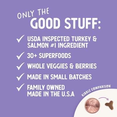 Deboned Turkey, Deboned Salmon, Salmon Meal, Turkey Meal, Chickpeas, Lentils, Chicken Fat (preserved with Mixed Tocopherols), Turkey Meal, Whole Sweet Potatoes, Pumpkin, Tapioca Starch, Peas, Salmon Oil, Coconut Oil (preserved with Mixed Tocopherols), Whole Carrots, Dried Seaweed Meal, Pomegranate, Blackberries, Whole Blueberries, Whole Cranberries, Raspberries, Potassium Chloride, Taurine, DL-Methionine, Spinach, Turmeric, Tomato, Beets, Parsley, Chicory Root Extract, Sage, Bovine Colostrum, Organic Apple Cider Vinegar, Ginger, Green Tea Extract, Vitamin A Acetate, Vitamin E Supplement, Riboflavin Supplement, Vitamin B12 Supplement, Vitamin D3 Supplement, Niacin Supplement, Choline Chloride, Pyridoxine Hydrochloride, Thiamine Mononitrate, Folic Acid, Biotin, Inositol, Organic Dehydrated Kelp, Zinc Polysaccharide Complex, Iron Polysaccharide Complex, Manganese Polysaccharide Complex, Copper Polysaccharide Complex, Calcium Iodate, Sodium Selenite, L-Carnitine, Yucca Schidigera Extract, Dried Enterococcus faecium Fermentation Product, Dried Lactobacillus acidophilus Fermentation Product, Dried Aspergillus niger Fermentation Extract, Dried Trichoderma longibrachiatum Fermentation Extract, Dried Bacillus subtilis Fermentation Extract, Rosemary Extract.