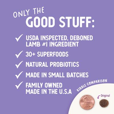 Lamb, Lamb Meal, Brown Rice, Pearled Barley, Salmon Meal, Oatmeal, Sweet Potatoes, Peas, Flaxseed, Brewers Dried Yeast, Dried Beet Pulp, Salmon Oil (source of DHA), Coconut Oil, Organic Apple Cider Vinegar, Organic Turmeric, Organic Black Pepper, Organic Ginger, Bovine Colostrum, Organic Blueberries, Cranberries, Organic Goji Berries, Organic Tart Cherries, Organic Pomegranate, Organic Pineapple, Organic Papaya, Organic Apple, Dried Kelp, Dried Seaweed Meal, New Zealand Green Mussel, Organic Carrots, Organic Pumpkin, Green Tea Extract, Sage Extract, Organic Parsley, Organic Spinach, Organic Kale, Sweet Basil, Thyme Extract, Organic Ashwagandha, Organic Chaga, Organic Lion’s Mane, Organic Reishi, Organic Turkey Tail, Organic Shiitake, Organic Maitake, Organic Cordyceps, Potassium Chloride, Vitamin A Acetate, Vitamin E Supplement, Riboflavin Supplement, Vitamin B12 Supplement, Vitamin D3 Supplement, Niacin Supplement, Choline Chloride, Pyridoxine Hydrochloride, Thiamine Mononitrate, Folic Acid, Biotin, Zinc Polysaccharide Complex, Iron Polysaccharide Complex, Manganese Polysaccharide Complex, Copper Polysaccharide Complex, Cobalt Polysaccharide Complex, Calcium lodate, Sodium Selenite, Yucca Schidigera Extract, Dried Lactobacillus Acidophilus Fermentation Product, Dried Lactobacillus Casei Fermentation Product, Dried Enterococcus Faecium Fermentation Product, Dried Bacillus Subtilis Fermentation Product, Dried Bacillus licheniformis Fermentation Product, Dried Bacillus Coagulants Fermentation Product, Dried Aspergillus Oryzae Fermentation Product, Dried Aspergillus Niger Fermentation Product.