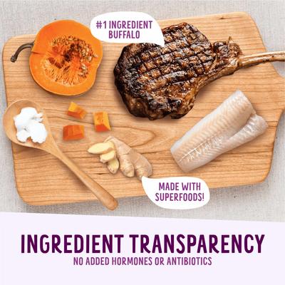 Buffalo, Deboned Whitefish, Buffalo Meal, Whitefish Meal (source of Omega 3 fatty acids), Chickpeas, Lentils, Salmon Oil (preserved with Mixed Tocopherols), Tapioca Starch, Whole Sweet Potatoes, Pumpkin, Peas, Coconut Oil (preserved with Mixed Tocopherols), Whole Carrots, Dried Seaweed Meal, Pomegranate, Blackberries, Whole Blueberries, Whole Cranberries, Raspberries, Potassium Chloride, Spinach, Turmeric, Tomato, Beets, Parsley, Chicory Root Extract, Sage, Bovine Colostrum, Organic Apple Cider Vinegar, Ginger, Green Tea Extract, Vitamin A Acetate, Vitamin E Supplement, Riboflavin Supplement, Vitamin B12 Supplement, Vitamin D3 Supplement, Niacin Supplement, Choline Chloride, Pyridoxine Hydrochloride, Thiamine Mononitrate, Folic Acid, Biotin, Inositol, Organic Dehydrated Kelp, Zinc Polysaccharide Complex, Iron Polysaccharide Complex, Manganese Polysaccharide Complex, Copper Polysaccharide Complex, Cobalt Polysaccharide Complex, Calcium Iodate, Sodium Selenite, Yucca Schidigera Extract, Pectin, Dried Lactobacillus acidophilus Fermentation Product, Dried Lactobacillus casei Fermentation Product, Dried Enterococcus faecium Fermentation Product, Dried Bacillus subtilis Fermentation Product, Dried Bacillus licheniformis Fermentation Product, Dried Baciollus coagulans Fermentation Product, Dried Aspergillus oryzae Fermentation Product, Dried Aspergillus niger Fermentation Product.