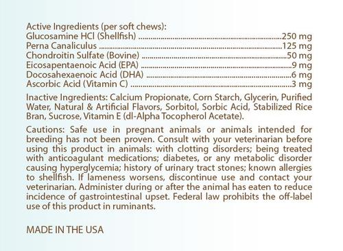 Active Ingredients: Glucosamine HCl (Shellfish), Perna Canaliculus, Chondroitin Sulfate (Bovine), Eicosapentaenoic Acid (EPA), Docosahexaenoic Acid (DHA), Ascorbic Acid (Vitamin C). Inactive Ingredients: Calcium Propionate, Corn Starch, Glycerin, Purified Water, Natural & Artificial Flavors, Sorbitol, Sorbic Acid, Stabilized Rice Bran, Sucrose, Vitamin E (dl-Alpha Tocopherol Acetate).