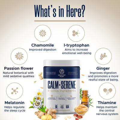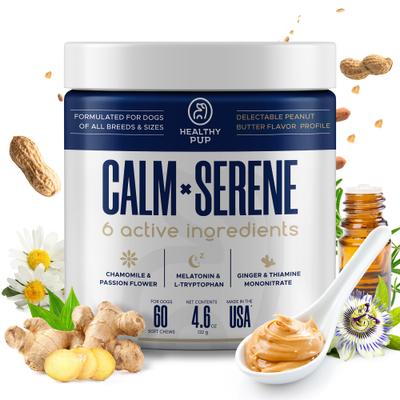 Treat your furry friend to a state of bliss with Healthy Pup Calming Peanut Butter Bliss Dog Supplement! This woof-tastic treat combines the nutty goodness of peanut butter with a dash of tranquility to help your buddy find his inner Zen. It's like a soothing spa retreat wrapped up in a delicious peanut buttery package. Made in the USA, this paw-fect supplement is loaded with hormones and botanicals like melatonin, ginger, chamomile and rosemary extract to promote a sense of calm when he’s feeling stressed. Plus, the natural peanut butter flavor has craveable appeal and fits a chicken-free or beef-free diet. With Healthy Pup Calming Peanut Butter Bliss, relaxation has never tasted so good!