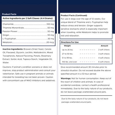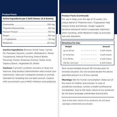 If the dog's condition worsens or does not improve, stop product administration and consult your veterinarian. Safe use in pregnant dogs or dogs intended for breeding has not been proven. Caution with concomitant use of MAO inhibitors and sedatives.Give recommended amount 30 minutes prior to stressful situation. Do not exceed double the above specified amount in a 12-hour period.