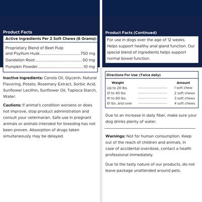 Say goodbye to your pup's scoot dance with Healthy Pup's Glands Fiber Dog Supplement! The fiber-loaded soft chew is crafted with herbal extracts to keep your best buddy's tummy troubles at bay. With this tail-wagging secret, your furry friend can finally strut their stuff without discomfort. So, let your canine companion groove in style and embrace the joy of smooth sailing with this supplement—because scooting is so last season! This natural bacon and chicken flavored supplement is made with wholesome ingredients like rosemary extract, dandelion root, pumpkin powder, psyllium husk and beet pulp. Working from within, it helps optimize your pup's bowel health, which in turn helps support healthy glands. Healthy Pup's Glands helps to prevent scooting and keep his anal sacs healthy.