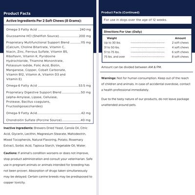Inactive Ingredients: Brewers Dried Yeast, Flaxseed, Glycerin, Dried Potato Product, Lecithin, Dried Shellfish Digest, Natural Flavouring, Water, Dicalcium Phosphate, Canola Oil, Maltodextrin, Tapioca Starch, Choline Bitartrate, Chondroitin Sulfate, Vitamin E Supplement, Fructooligosaccharides, Dried Aspergillus oryzae Fermentation Product, Calcium Ascorbate, Sorbic Acid, Mixed Tocopherols, Vegetable Oil, Vitamin A Palmitate, Citric Acid, Biotin, Zinc Sulfate, Niacin Supplement, Ferrous Sulfate, Vitamin D3 Supplement, Pantothenic Acid, Menadione Sodium Bisulfite Complex, Vitamin B12 Sulfate, Potassium Iodide, Copper Carbonate, Folic Acid, Cobalt Carbonate, Magnesium Stearate.
