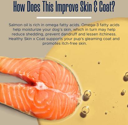 The Healthy Pup Skin Omega Supplement for Dogs supports healthy skin and a luxurious coat to keep your furbaby looking and feeling paw-some! This omega-based supplement helps to fight shedding, prevent dandruff and reduce itchiness. It’s infused with salmon oil to help moisturize your best friend’s skin, and also includes biotin, vitamin E, EPA, DHA and omega-3 and omega-6 fatty acids. Bacon and chicken flavors make the supplement su-paw tasty, so it’s easy to feed to your best friend.