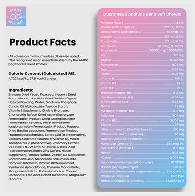Feeding Directions:(Give with each meal)Dogs up to 30 lbs. 2 soft chews31 to 50 lbs. 4 soft chews51 to 75 lbs. 6 soft chewsOver 76 lbs. 8 soft chewsCan be divided among AM & PM
