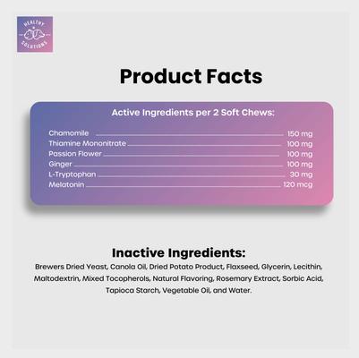 Active Ingredients per 2 soft chews: Chamomile 150 mg, Thiamine Mononitrate 100 mg, Passion Flower 100 mg, Ginger 100 mg, L-Tryptophan 30 mg, Melatonin 120 mcg