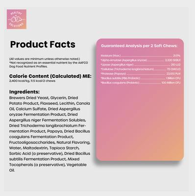 Brewer’s Dried Yeast, Glycerin, Dried Potato Product, Flaxseed, Lecithin, Canola Oil, Natural Flavoring, Water, Maltodextrin, Calcium Sulfate, Dried Bacillus subtilis Fermentation Product, Dried Aspergillus oryzae Fermentation Product, Dried Aspergillus niger Fermentation Solubles, Dried Trichoderma longibrachiatum Fermentation Product, Carica papaya, Dried Bacillus coagulans Fermentation Product, Fructooligosaccharides, Tapioca Starch, Sorbic Acid (a preservative), Mixed Tocopherols (a preservative), Rosemary Extract, and Vegetable Oil.