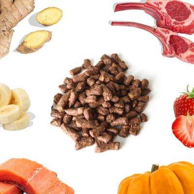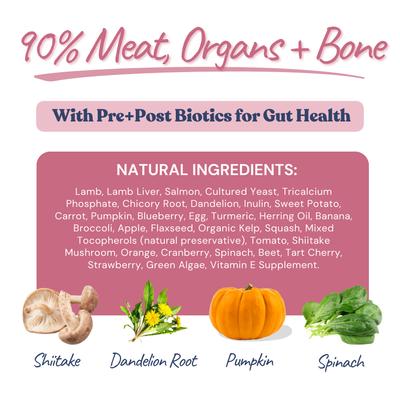 Cordero, hígado de cordero, salmón, levadura cultivada, inulina, raíz de achicoria, diente de león, zanahorias, calabaza, manzanas, brócoli, arándanos, linaza, plátano, calabaza, perejil, huevo, algas orgánicas, aceite de arenque, cúrcuma, tocoferoles mixtos (conservante natural), tomate, hongo shiitake, naranja, arándano rojo, espinacas, remolacha, cereza ácida, fresa, suplemento de vitamina E.