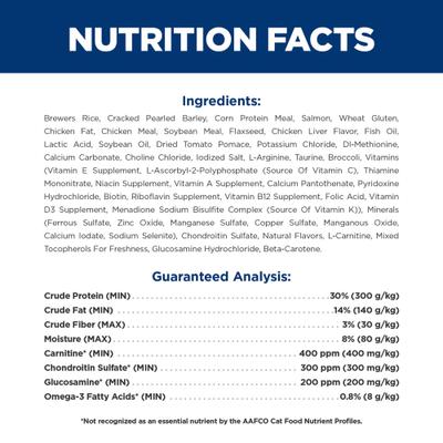 Brewers Rice, Cracked Pearled Barley, Corn Protein Meal, Salmon, Wheat Gluten, Chicken Fat, Chicken Meal, Soybean Meal, Flaxseed, Chicken Liver Flavor, Fish Oil, Lactic Acid, Soybean Oil, Dried Tomato Pomace, Potassium Chloride, DL-Methionine, Calcium Carbonate, Choline Chloride, Iodized Salt, L-Arginine, Taurine, Broccoli, vitamins (Vitamin E Supplement, L-Ascorbyl-2-Polyphosphate (source of Vitamin C), Thiamine Mononitrate, Niacin Supplement, Vitamin A Supplement, Calcium Pantothenate, Pyridoxine Hydrochloride, Biotin, Riboflavin Supplement, Vitamin B12 Supplement, Folic Acid, Vitamin D3 Supplement, Menadione Sodium Bisulfite Complex (source of Vitamin K)), minerals (Ferrous Sulfate, Zinc Oxide, Manganese Sulfate, Copper Sulfate, Manganous Oxide, Calcium Iodate, Sodium Selenite), Chondroitin Sulfate, Natural Flavors, L-Carnitine, Mixed Tocopherols for freshness, Glucosamine Hydrochloride, Beta-Carotene.