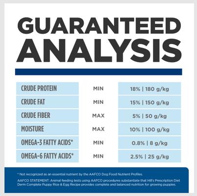 Hill's Prescription Diet Derm Complete Puppy Environmental/Food Sensitivities Rice & Egg Recipe Dry Dog Food is a therapeutic food designed to keep your puppy healthy and happy. It is formulated by nutritionists and veterinarians to help manage your furbaby’s environmental or food sensitivities. It supports the skin’s barriers against environmental irritants all year round, and helps to reduce licking, scratching, headshaking and red skin. This food is made right here in the USA using ingredients you can trust, making it a paw-some choice for pups who have food and environmental sensitivities.