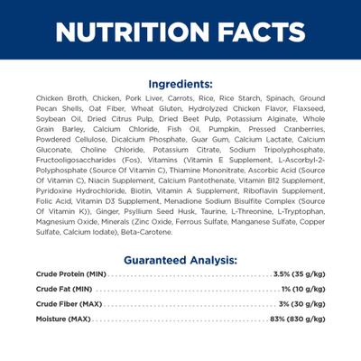 Chicken Broth, Chicken, Pork Liver, Carrots, Rice, Rice Starch, Spinach, Ground Pecan Shells, Oat Fiber, Wheat Gluten, Hydrolyzed Chicken Flavor, Flaxseed, Soybean Oil, Dried Citrus Pulp, Dried Beet Pulp, Potassium Alginate, Whole Grain Barley, Calcium Chloride, Fish Oil, Pumpkin, Pressed Cranberries, Powdered Cellulose, Dicalcium Phosphate, Guar Gum, Calcium Lactate, Calcium Gluconate, Choline Chloride, Potassium Citrate, Sodium Tripolyphosphate, Fructooligosaccharides (FOS), vitamins (Vitamin E Supplement, L-Ascorbyl-2-Polyphosphate (source of Vitamin C), Thiamine Mononitrate, Ascorbic Acid (source of Vitamin C), Niacin Supplement, Calcium Pantothenate, Vitamin B12 Supplement, Pyridoxine Hydrochloride, Biotin, Vitamin A Supplement, Riboflavin Supplement, Folic Acid, Vitamin D3 Supplement, Menadione Sodium Bisulfite Complex (source of Vitamin K)), Ginger, Psyllium Seed Husk, Taurine, L-Threonine, L-Tryptophan, Magnesium Oxide, minerals (Zinc Oxide, Ferrous Sulfate, Manganese Sulfate, Copper Sulfate, Calcium Iodate), Beta-Carotene.