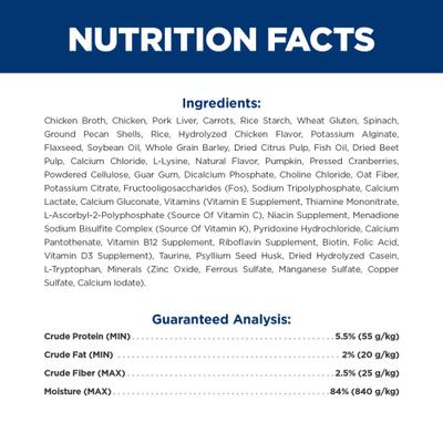 Chicken Broth, Chicken, Pork Liver, Carrots, Rice Starch, Wheat Gluten, Spinach, Ground Pecan Shells, Rice, Hydrolyzed Chicken Flavor, Potassium Alginate, Flaxseed, Soybean Oil, Whole Grain Barley, Dried Citrus Pulp, Fish Oil, Dried Beet Pulp, Calcium Chloride, L-Lysine, Natural Flavor, Pumpkin, Pressed Cranberries, Powdered Cellulose, Guar Gum, Dicalcium Phosphate, Choline Chloride, Oat Fiber, Potassium Citrate, Fructooligosaccharides (FOS), Sodium Tripolyphosphate, Calcium Lactate, Calcium Gluconate, vitamins (Vitamin E Supplement, Thiamine Mononitrate, L-Ascorbyl-2-Polyphosphate (source of Vitamin C), Niacin Supplement, Menadione Sodium Bisulfite Complex (source of Vitamin K), Pyridoxine Hydrochloride, Calcium Pantothenate, Vitamin B12 Supplement, Riboflavin Supplement, Biotin, Folic Acid, Vitamin D3 Supplement), Taurine, Psyllium Seed Husk, Dried Hydrolyzed Casein, L-Tryptophan, minerals (Zinc Oxide, Ferrous Sulfate, Manganese Sulfate, Copper Sulfate, Calcium Iodate).