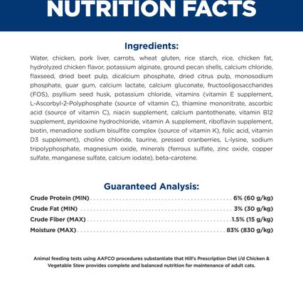 Support your furbaby’s digestive health with Hill’s Prescription Diet i/d Digestive Care Chicken & Vegetable Stew Adult Cat Food. This recipe is highly digestible to promote easy nutrient absorption, plus it meets your adult kitty’s nutritional needs. It features a blend of prebiotic fibers to help activate the gut microbiome to support digestive health. It also contains added electrolytes, B vitamins, and omega-3 and omega-6 fatty acids. Antioxidants help support a healthy immune system, and this recipe also helps manage digestive upset. It’s crafted in the USA with ingredients you can trust to support your best friend’s overall well-being.