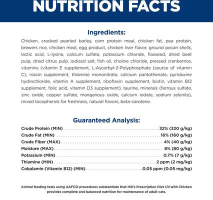Chicken, Cracked Pearled Barley, Corn Protein Meal, Chicken Fat, Pea Protein, Brewers Rice, Chicken Meal, Egg Product, Chicken Liver Flavor, Ground Pecan Shells, Lactic Acid, L-Lysine, Calcium Sulfate, Potassium Chloride, Flaxseed, Dried Beet Pulp, Dried Citrus Pulp, Iodized Salt, Fish Oil, Choline Chloride, Pressed Cranberries, vitamins (Vitamin E Supplement, L-Ascorbyl-2-Polyphosphate (source of Vitamin C), Niacin Supplement, Thiamine Mononitrate, Calcium Pantothenate, Pyridoxine Hydrochloride, Vitamin A Supplement, Riboflavin Supplement, Biotin, Vitamin B12 Supplement, Folic Acid, Vitamin D3 Supplement), Taurine, minerals (Ferrous Sulfate, Zinc Oxide, Copper Sulfate, Manganous Oxide, Calcium Iodate, Sodium Selenite), Mixed Tocopherols for freshness, Natural Flavors, Beta-Carotene.