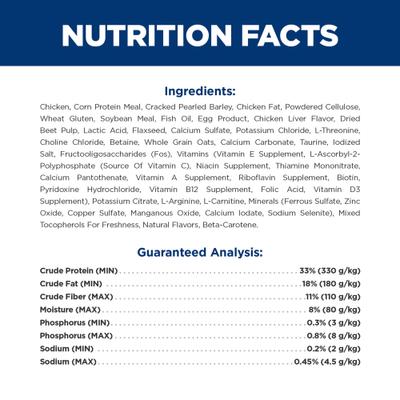 Chicken, Corn Protein Meal, Cracked Pearled Barley, Chicken Fat, Powdered Cellulose, Wheat Gluten, Soybean Meal, Fish Oil, Egg Product, Chicken Liver Flavor, Dried Beet Pulp, Lactic Acid, Flaxseed, Calcium Sulfate, Potassium Chloride, L-Threonine, Choline Chloride, Betaine, Whole Grain Oats, Calcium Carbonate, Taurine, Iodized Salt, Fructooligosaccharides (FOS), Vitamins (Vitamin E Supplement, L-Ascorbyl-2-Polyphosphate (source of Vitamin C), Niacin Supplement, Thiamine Mononitrate, Calcium Pantothenate, Vitamin A Supplement, Riboflavin Supplement, Biotin, Pyridoxine Hydrochloride, Vitamin B12 Supplement, Folic Acid, Vitamin D3 Supplement), Potassium Citrate, L-Arginine, L-Carnitine, Minerals (Ferrous Sulfate, Zinc Oxide, Copper Sulfate, Manganous Oxide, Calcium Iodate, Sodium Selenite), Mixed Tocopherols for freshness, Natural Flavors, Beta-Carotene.