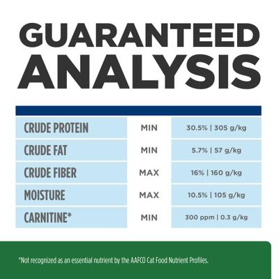 Arroz cervecero, harina de subproductos de pollo, harina de gluten de maíz, celulosa en polvo, saborizante de pollo hidrolizado, aceite de soya, saborizante de hígado de pollo, ácido láctico, cloruro de potasio, sulfato de calcio, cloruro de colina, L-lisina, DL-metionina, monoestearato de glicerilo, sal yodada, vitaminas (suplemento de vitamina E, L-ascorbil-2-polifosfato (fuente de vitamina C), suplemento de niacina, mononitrato de tiamina, suplemento de vitamina A, pantotenato de calcio, suplemento de riboflavina, biotina, suplemento de vitamina B12, clorhidrato de piridoxina, ácido fólico, vitamina Suplemento D3), taurina, minerales (sulfato ferroso, óxido de zinc, sulfato de cobre, óxido manganoso, yodato de calcio, selenito de sodio), L-carnitina, L-treonina, mezcla de tocoferoles para frescura, sabores naturales, betacaroteno.