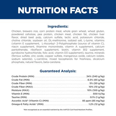 Chicken, Brewers Rice, Corn Protein Meal, Whole Grain Wheat, Wheat Gluten, Powdered Cellulose, Pea Protein, Chicken Meal, Chicken Fat, Chicken Liver Flavor, Dried Beet Pulp, Calcium Sulfate, Lactic Acid, Potassium Chloride, Choline Chloride, Soybean Oil, DL-Methionine, Iodized Salt, L-Lysine, Vitamins (Vitamin E Supplement, L-Ascorbyl-2-Polyphosphate (source of Vitamin C), Niacin Supplement, Thiamine Mononitrate, Vitamin A Supplement, Calcium Pantothenate, Riboflavin Supplement, Biotin, Vitamin B12 Supplement, Pyridoxine Hydrochloride, Folic Acid, Vitamin D3 Supplement), Taurine, Minerals (Ferrous Sulfate, Zinc Oxide, Copper Sulfate, Manganous Oxide, Calcium Iodate, Sodium Selenite), L-Carnitine, Mixed Tocopherols for freshness, Dicalcium Phosphate, Natural Flavors, Beta-Carotene.