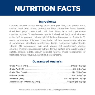 Pollo, Cebada perlada quebrada, arroz integral, fibra de guisante, harina de proteína de maíz, harina de pollo, pulpa de tomate deshidratada, fibra de avena, saborizante de hígado de pollo, linaza, pulpa de remolacha deshidratada, aceite de coco, saborizante de hígado de cerdo, ácido láctico, cloruro de potasio, L-lisina, DL-metionina, zanahorias, sal yodada, ácido lipoico, vitaminas (suplemento de vitamina E, L-ascorbil-2-polifosfato (fuente de vitamina C), suplemento de niacina, mononitrato de tiamina, pantotenato de calcio, suplemento de vitamina A, suplemento de riboflavina, biotina, clorhidrato de piridoxina, suplemento de vitamina B12, ácido fólico, suplemento de vitamina D3), cloruro de colina, minerales (sulfato de manganeso, sulfato ferroso, óxido de zinc, sulfato de cobre, yodato de calcio, selenito de sodio), taurina, mezcla de tocoferoles para frescura, sabores naturales. L-Carnitina, Betacaroteno.