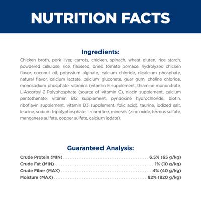 Chicken Broth, Pork Liver, Carrots, Chicken, Spinach, Wheat Gluten, Rice Starch, Powdered Cellulose, Rice, Flaxseed, Dried Tomato Pomace, Hydrolyzed Chicken Flavor, Coconut Oil, Potassium Alginate, Calcium Chloride, Dicalcium Phosphate, Natural Flavor, Calcium Lactate, Calcium Gluconate, Guar Gum, Choline Chloride, Monosodium Phosphate, Vitamins (Vitamin E Supplement, Thiamine Mononitrate, L-Ascorbyl-2-Polyphosphate (Source of Vitamin C), Niacin Supplement, Calcium Pantothenate, Vitamin B12 Supplement, Pyridoxine Hydrochloride, Biotin, Riboflavin Supplement, Vitamin D3 Supplement, Folic Acid), Taurine, Iodized Salt, Leucine, Sodium Tripolyphosphate, L-Carnitine, Minerals (Zinc Oxide, Ferrous Sulfate, Manganese Sulfate, Copper Sulfate, Calcium Iodate).