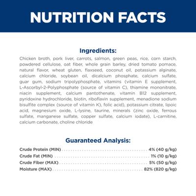 Chicken Broth, Pork Liver, Carrots, Salmon, Green Peas, Rice, Corn Starch, Powdered Cellulose, Oat Fiber, Whole Grain Barley, Dried Tomato Pomace, Natural Flavor, Wheat Gluten, Flaxseed, Coconut Oil, Potassium Alginate, Calcium Chloride, Soybean Oil, Dicalcium Phosphate, Calcium Sulfate, Guar Gum, Sodium Tripolyphosphate, Vitamins (Vitamin E Supplement, L-Ascorbyl-2-Polyphosphate (Source of Vitamin C), Thiamine Mononitrate, Niacin Supplement, Calcium Pantothenate, Vitamin B12 Supplement, Pyridoxine Hydrochloride, Biotin, Riboflavin Supplement, Menadione Sodium Bisulfite Complex (Source of Vitamin K), Folic Acid), Potassium Citrate, Lipoic Acid, Magnesium Oxide, L-Lysine, Taurine, Minerals (Zinc Oxide, Ferrous Sulfate, Manganese Sulfate, Copper Sulfate, Calcium Iodate), L-Carnitine, Calcium Carbonate, Choline Chloride.