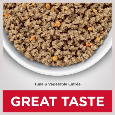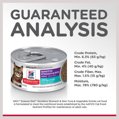 Hill’s Science Diet Adult Sensitive Stomach & Sensitive Skin Tuna & Vegetable Entree Canned Cat Food uses easy-to-digest ingredients in a grain-free formula to support your furbaby’s digestive and skin health. Natural fibers help promote easier stool pickup, while omega-6 fatty acids and vitamin E nourish your adult cat’s skin and add luster to their coat. This grain-free recipe is made with natural ingredients, so it’s purr-fect for cats with food sensitivities. There’s more to love with the new look of Science Diet. Some Science Diet products also have new names and new formulas.