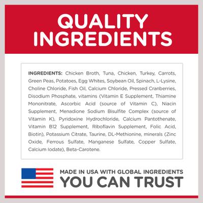 Chicken Broth, Tuna, Chicken, Turkey, Carrots, Green Peas, Potatoes, Egg Whites, Soybean Oil, Spinach, L-Lysine, Choline Chloride, Fish Oil, Calcium Chloride, Pressed Cranberries, Disodium Phosphate, vitamins (Vitamin E Supplement, Thiamine Mononitrate, Ascorbic Acid (source of Vitamin C), Niacin Supplement, Menadione Sodium Bisulfite Complex (source of Vitamin K), Pyridoxine Hydrochloride, Calcium Pantothenate, Vitamin B12 Supplement, Riboflavin Supplement, Folic Acid, Biotin), Potassium Citrate, DL-Methionine, minerals (Zinc Oxide, Ferrous Sulfate, Manganese Sulfate, Copper Sulfate, Calcium Iodate), Taurine, Beta-Carotene.