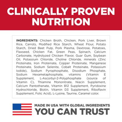 Chicken Broth, Chicken, Pork Liver, Brown Rice, Carrots, Modified Rice Starch, Wheat Flour, Potato Starch, Dried Beet Pulp, Pork Plasma, Dextrose, Potatoes, Flaxseed, Chicken Fat, Green Peas, Spinach, Calcium Carbonate, Hydrolyzed Chicken Flavor, Guar Gum, Soybean Oil, Potassium Chloride, Choline Chloride, minerals (Zinc Proteinate, Iron Proteinate, Copper Proteinate, Manganese Proteinate, Sodium Selenite, Cobalt Proteinate, Potassium Iodide), Sodium Pyrophosphate, Disodium Phosphate, Sodium Hexametaphosphate, vitamins (Vitamin E Supplement, L-Ascorbyl-2-Polyphosphate (source of Vitamin C), Thiamine Mononitrate, Niacin Supplement, Calcium Pantothenate, Vitamin B12 Supplement, Pyridoxine Hydrochloride, Biotin, Vitamin D3 Supplement, Riboflavin Supplement, Folic Acid), L-Lysine, Taurine, Caramel color.