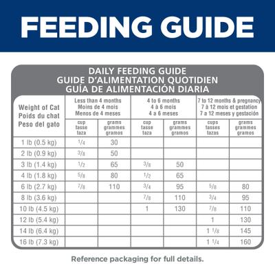 Adjust feeding amounts as necessary to maintain optimal weight. If you are unsure, ask your veterinarian.New to this food? Mix increasing amounts of your pet's new food with decreasing amounts of the old food over a 7-day period.Keep fresh water available at all times!Your pets nutritional needs may change as they age. Ask your vet at every checkup.To prevent suffocation, keep the packaging out of the reach of pets and children.
