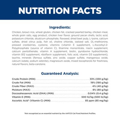 Chicken, Brown Rice, Wheat Gluten, Chicken Fat, Cracked Pearled Barley, Chicken Meal, Whole Grain Oats, Egg Product, Chicken Liver Flavor, Ground Pecan Shells, Lactic Acid, Potassium Chloride, Dicalcium Phosphate, Flaxseed, Dried Beet Pulp, L-Lysine, Calcium Sulfate, Dried Citrus Pulp, Fish Oil, Choline Chloride, Iodized Salt, DL-Methionine, Pressed Cranberries, Cysteine, Vitamins (Vitamin E Supplement, L-Ascorbyl-2-Polyphosphate (source of Vitamin C), Thiamine Mononitrate, Niacin Supplement, Calcium Pantothenate, Vitamin A Supplement, Biotin, Pyridoxine Hydrochloride, Vitamin B12 Supplement, Riboflavin Supplement, Folic Acid, Vitamin D3 Supplement), Taurine, Minerals (Ferrous Sulfate, Zinc Oxide, Copper Sulfate, Manganous Oxide, Calcium Iodate, Sodium Selenite), Magnesium Oxide, Mixed Tocopherols for freshness, Natural Flavors, Beta-Carotene.