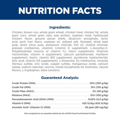 Chicken, Brown Rice, Whole Grain Wheat, Chicken Meal, Chicken Fat, Whole Grain Corn, Whole Grain Oats, Pea Protein, Soybean Meal, Hydrolyzed Chicken Flavor, Ground Pecan Shells, Dicalcium Phosphate, Lactic Acid, Pork Liver Flavor, Soybean Oil, Iodized Salt, Flaxseed, Dried Beet Pulp, Dried Citrus Pulp, Potassium Chloride, Fish Oil, Choline Chloride, Pressed Cranberries, Vitamins (Vitamin E Supplement, L-Ascorbyl-2-Polyphosphate (source of Vitamin C), Niacin Supplement, Thiamine Mononitrate, Vitamin A Supplement, Calcium Pantothenate, Riboflavin Supplement, Biotin, Vitamin B12 Supplement, Pyridoxine Hydrochloride, Folic Acid, Vitamin D3 Supplement), L-Threonine, DL-Methionine, Minerals (Ferrous Sulfate, Zinc Oxide, Copper Sulfate, Manganous Oxide, Calcium Iodate, Sodium Selenite), Taurine, Mixed Tocopherols for freshness, Natural Flavors, L-Tryptophan, Beta-Carotene.