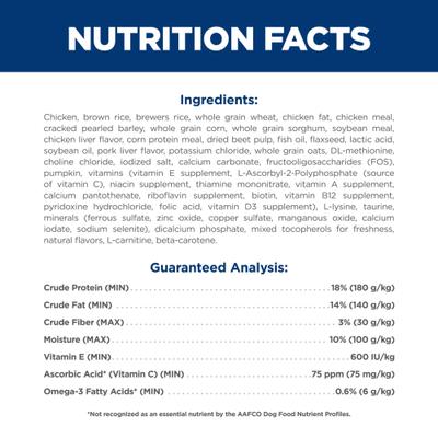 Chicken, Brown Rice, Brewers Rice, Whole Grain Wheat, Chicken Fat, Chicken Meal, Cracked Pearled Barley, Whole Grain Corn, Whole Grain Sorghum, Soybean Meal, Chicken Liver Flavor, Corn Protein Meal, Dried Beet Pulp, Fish Oil, Flaxseed, Lactic Acid, Soybean Oil, Pork Liver Flavor, Potassium Chloride, Whole Grain Oats, DL-Methionine, Choline Chloride, Iodized Salt, Calcium Carbonate, Fructooligosaccharides (FOS), Pumpkin, vitamins (Vitamin E Supplement, L-Ascorbyl-2-Polyphosphate (source of Vitamin C), Niacin Supplement, Thiamine Mononitrate, Vitamin A Supplement, Calcium Pantothenate, Riboflavin Supplement, Biotin, Vitamin B12 Supplement, Pyridoxine Hydrochloride, Folic Acid, Vitamin D3 Supplement), L-Lysine, Taurine, minerals (Ferrous Sulfate, Zinc Oxide, Copper Sulfate, Manganous Oxide, Calcium Iodate, Sodium Selenite), Dicalcium Phosphate, Mixed Tocopherols for freshness, Natural Flavors, L-Carnitine, Beta-Carotene.