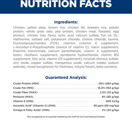 Chicken, Yellow Peas, Brown Rice, Chicken Fat, Brewers Rice, Potato Protein, Whole Grain Oats, Pea Protein, Chicken Meal, Flaxseed, Egg Product, Chicken Liver Flavor, Lactic Acid, Calcium Sulfate, Fish Oil, DL-Methionine, Iodized Salt, Potassium Chloride, Choline Chloride, Taurine, Fructooligosaccharides (FOS), vitamins (Vitamin E Supplement, L-Ascorbyl-2-Polyphosphate (source of Vitamin C), Niacin Supplement, Thiamine Mononitrate, Calcium Pantothenate, Vitamin A Supplement, Biotin, Riboflavin Supplement, Pyridoxine Hydrochloride, Vitamin B12 Supplement, Folic Acid, Vitamin D3 Supplement), minerals (Ferrous Sulfate, Zinc Oxide, Copper Sulfate, Manganous Oxide, Calcium Iodate, Sodium Selenite), Mixed Tocopherols for freshness, Natural Flavors, Beta-Carotene.