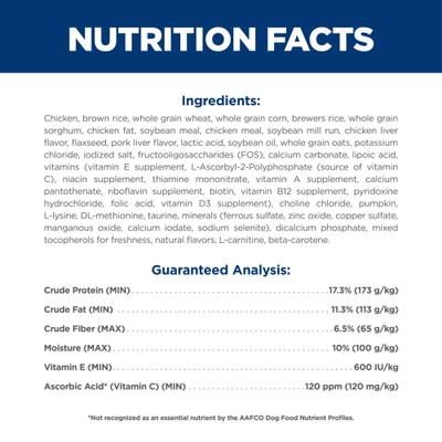 Chicken, Brown Rice, Whole Grain Wheat, Whole Grain Corn, Brewers Rice, Whole Grain Sorghum, Chicken Fat, Soybean Meal, Chicken Meal, Soybean Mill Run, Chicken Liver Flavor, Flaxseed, Pork Liver Flavor, Lactic Acid, Soybean Oil, Whole Grain Oats, Potassium Chloride, Iodized Salt, Fructooligosaccharides (FOS), Calcium Carbonate, Lipoic Acid, vitamins (Vitamin E Supplement, L-Ascorbyl-2-Polyphosphate (source of Vitamin C), Niacin Supplement, Thiamine Mononitrate, Vitamin A Supplement, Calcium Pantothenate, Riboflavin Supplement, Biotin, Vitamin B12 Supplement, Pyridoxine Hydrochloride, Folic Acid, Vitamin D3 Supplement), Choline Chloride, Pumpkin, L-Lysine, DL-Methionine, Taurine, minerals (Ferrous Sulfate, Zinc Oxide, Copper Sulfate, Manganous Oxide, Calcium Iodate, Sodium Selenite), Dicalcium Phosphate, Mixed Tocopherols for freshness, Natural Flavors, L-Carnitine, Beta-Carotene.