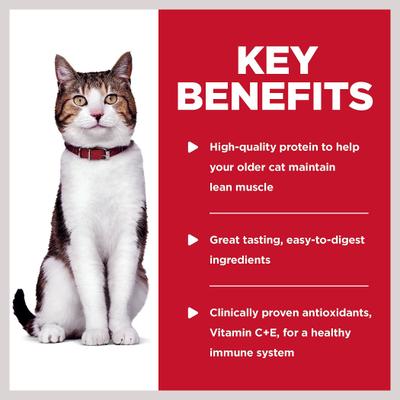 Whether your senior cat still keeps up with her active lifestyle, or chooses to relax around the house, Hill's Science Diet Senior 7+ Tender Chicken Recipe Cat Food is designed to support her own personality! Each single-serve cat food pouch is made in the USA from decadently delicious ingredients that are picked to benefit your senior cat. Gourmet pieces of chicken are covered in a yummy gravy, tempting your sidekick with the flavors and easy-to-enjoy moist texture she loves. Key nutrients and proteins maintain her lean muscles while antioxidants, amino acids and vitamins C and E support her immune system so she’s ready for whatever her golden years bring her!