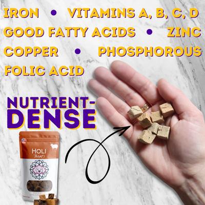 Give your pup the nutrition he needs and the flavor he craves with HOLI Lamb Liver Grain-Free Freeze-Dried Dog Treats. These freeze-dried treats retain all the nutrition, flavor and texture of raw meat without the mess and safety concerns. They’re made with 100 percent lamb liver, an excellent source of protein, iron and vitamin A. Each scrumptious treat can be given whole, broken into smaller pieces for training or even rehydrated for a juicy, delicious surprise for your good boy. Proudly sourced and made in the USA.