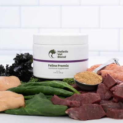 Upgrade your kitty’s diet with the Holistic Vet Blend Feline Premix Powder Nutritional Supplement for Cats. If you’re tired of not knowing what’s in your cat’s food or worrying about the artificial additives and preservatives found in commercial cat food, this premix powder is the purr-fect solution. With this feline blend you can confidently provide your cat with the best nutrition. Simply mix this supplement with organic, high-quality ingredients of your choosing (sold separately), and in less than 15 minutes, you’ll have a healthy meal packed with the essential nutrients your kitty needs to thrive. Comes with exclusive recipes crafted by animal nutritionists and veterinarians—so you can be sure you’re giving your favorite feline superior nutrition.