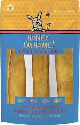 Treat your furry friend to a protein-packed chewing experience with Honey I’m Home 10” Honey Coated Buffalo Collagen Rolls Dog Chews. These rolls are naturally rich in chondroitin and glucosamine, which support healthy joints and coat. Made with collagen found below the top layer of skin, these treats have higher protein and less fat than traditional rawhide treats, making them easier to digest. Honey I’m Home only uses simple, easy to read ingredients like water buffalo and honey, making these chews safe and nutritious for pups with beef and poultry aversions. With no added grains, antibiotics, hormones, or dyes, you can trust that your pet is getting a natural, high-quality chew.